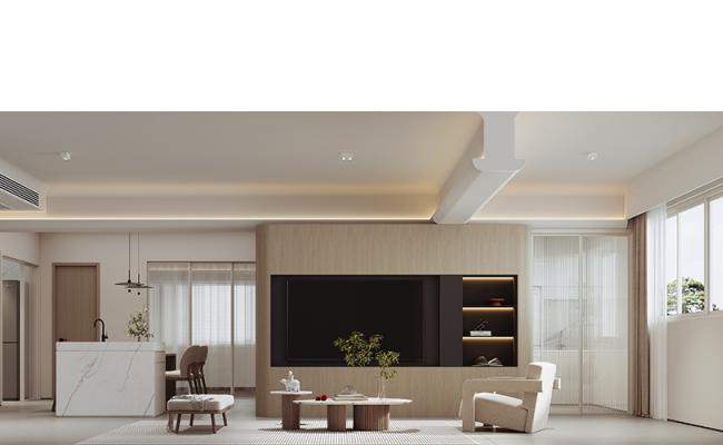 現(xiàn)代風格空間設計理念 本空間以「溫潤極簡·自然共生」為核心,以米白、淺木色構建柔和基底,弱化硬朗線條,營造松弛的居住氛圍。開放式布局結(jié)合挑高空間,最大化引入自然光線,讓視野通透舒展。木質(zhì)感柜體與簡約軟裝相融,摒棄冗余裝飾,以“少而精”的設計邏輯,平衡現(xiàn)代美學的利落與自然材質(zhì)的溫度,打造兼具實用與詩意的生活場域。