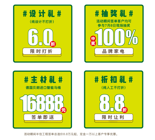 活動期間(6月17日-7月8日),簽單下定業主可享受設計費6折,人工8.8折簽單優惠,還可獲贈價值16888元德國進口貝朗智能馬桶一個,7月8日可到財富廣場東塔參與品牌家電抽獎,百分百有獎,數量有限,抽完即止。