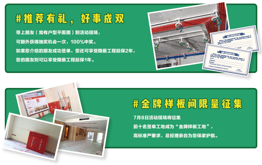 與好伙伴同享好禮,就是節日的意義。那么,這次驚喜大禮怎能不告訴你身邊的小伙伴呢。推薦好友成功簽單,豪禮翻倍。7月8日活動現場推薦好友成功簽單,您 即可享受隱蔽工程延保2年,您的朋友 也能享受隱蔽工程延保1年。好品質,值得分享。