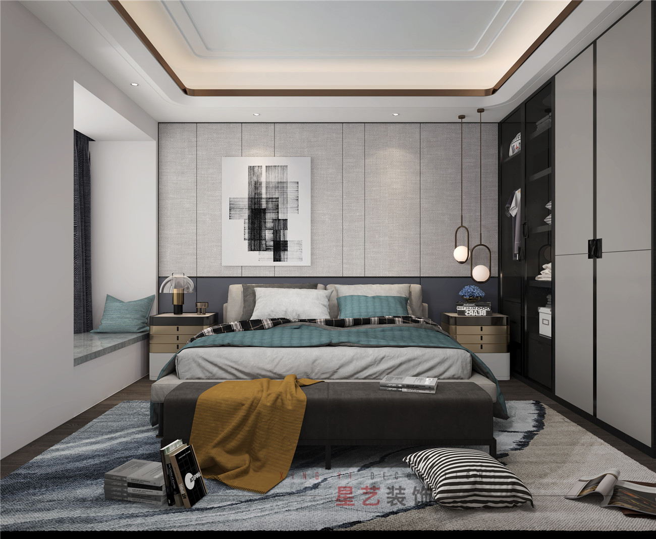 效果圖和實景圖中的主臥都用了大量的對稱元素,墻面,衣柜和天花板都有用到對稱的手法,效果圖整體色調偏向黑白灰,用橘色做點綴,簡約又不平凡。