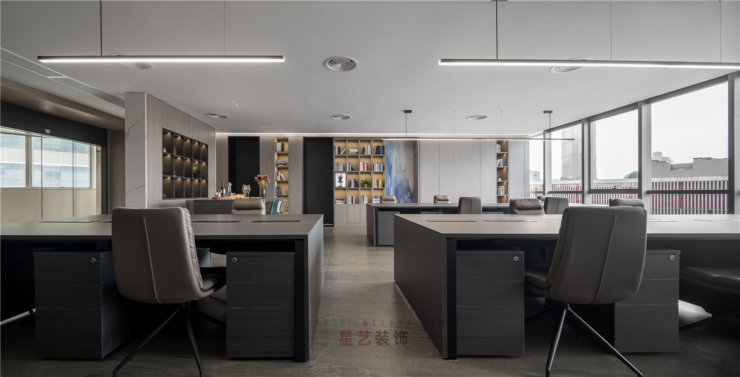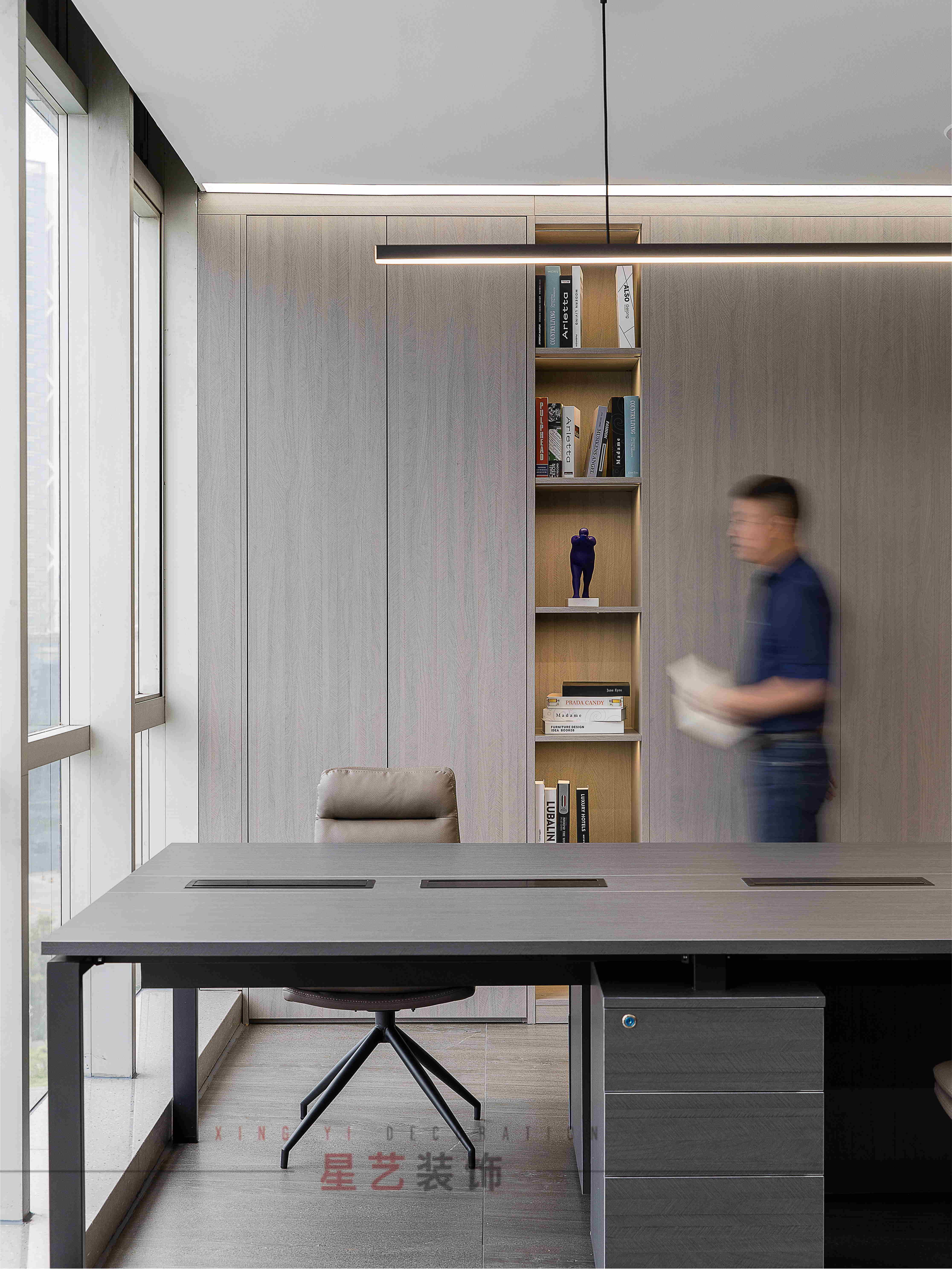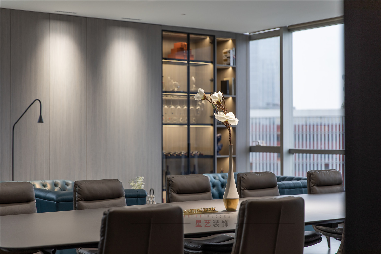 會議區(qū)也可作為接待區(qū),休息區(qū),學習區(qū),隱形儲物柜實用又美觀,整面的落地窗讓整個空間干凈明亮,既能享受家的愜意,也能減少工作帶來的的浮躁與不安。
