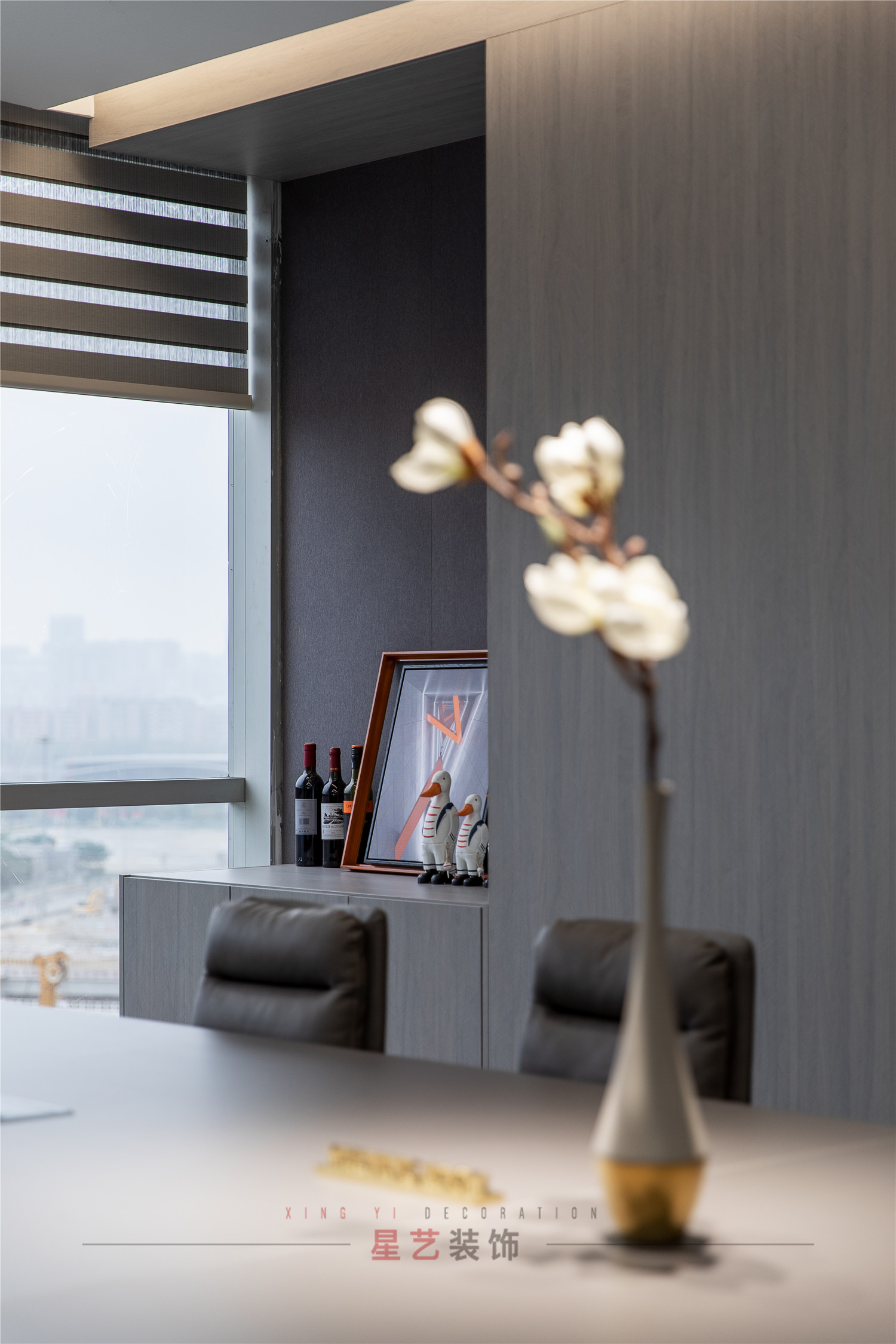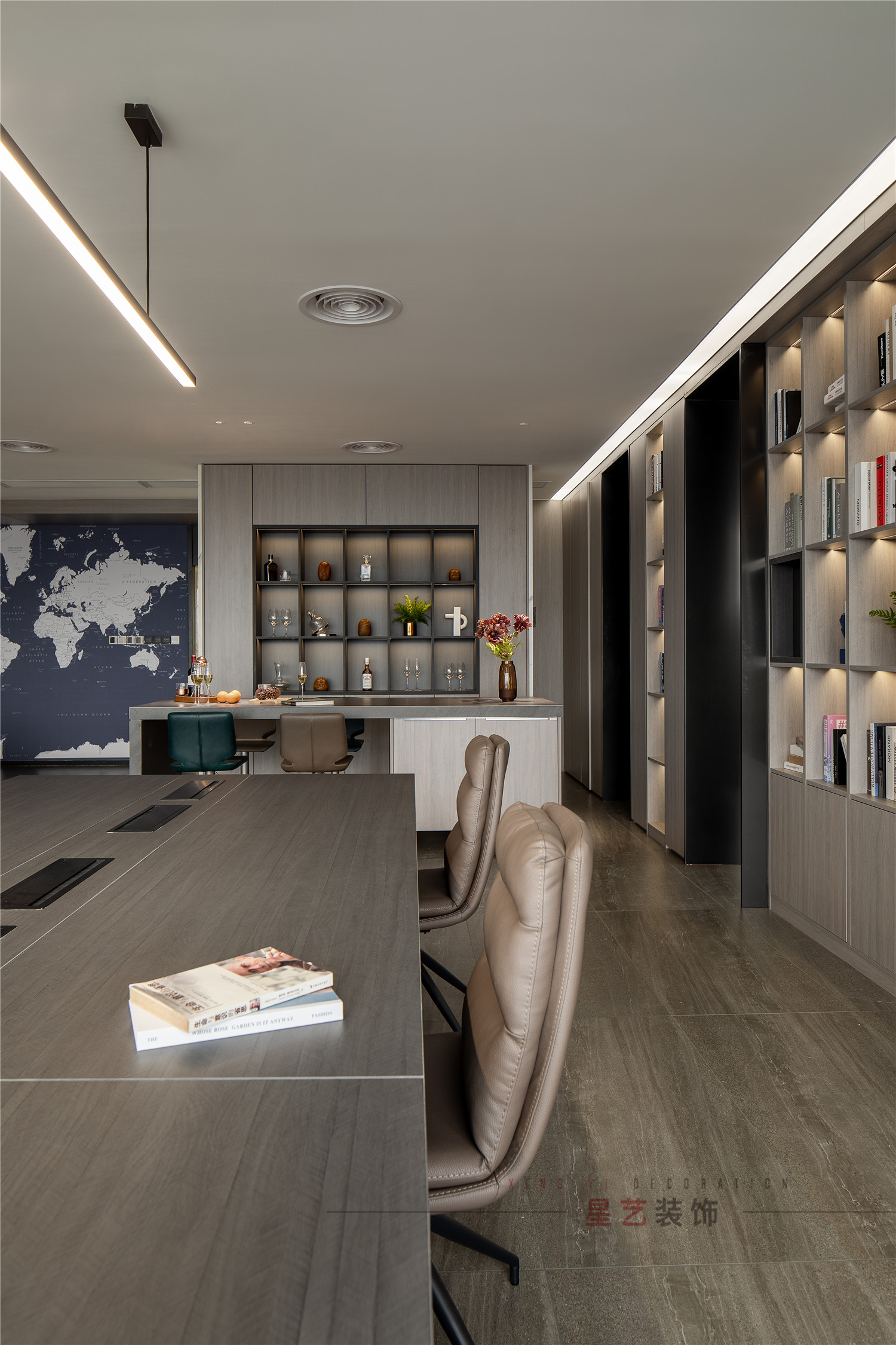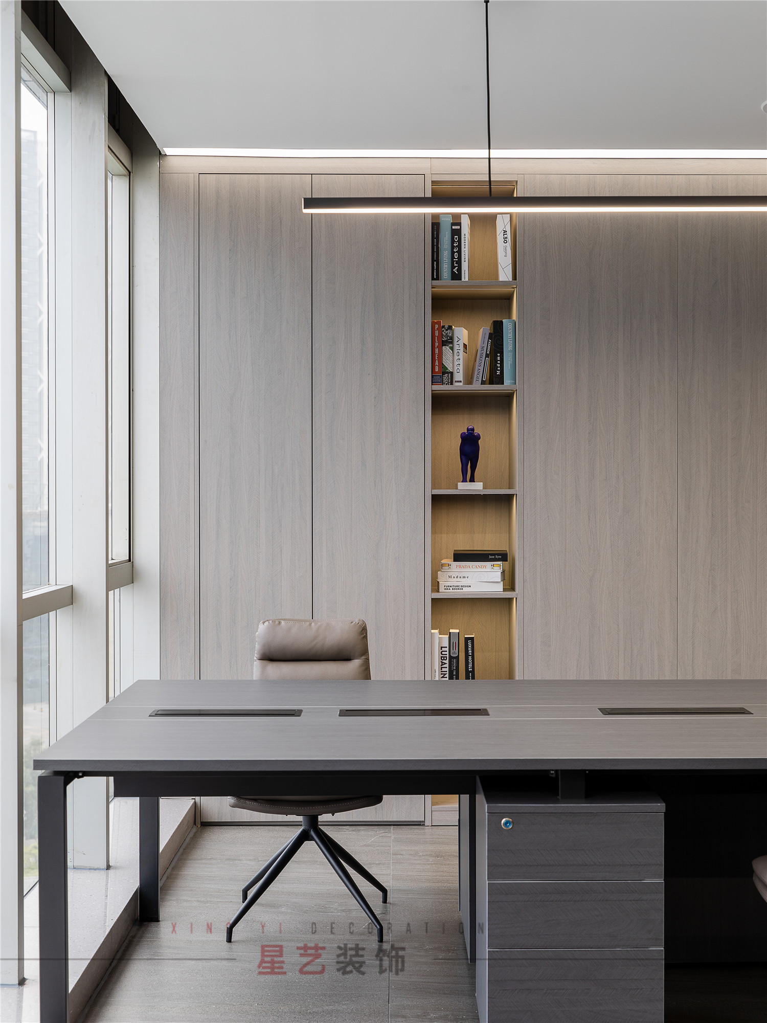 會議區(qū)也可作為接待區(qū),休息區(qū),學習區(qū),隱形儲物柜實用又美觀,整面的落地窗讓整個空間干凈明亮,既能享受家的愜意,也能減少工作帶來的的浮躁與不安。