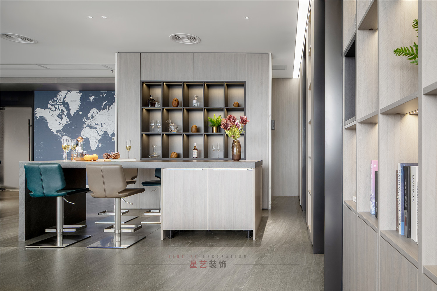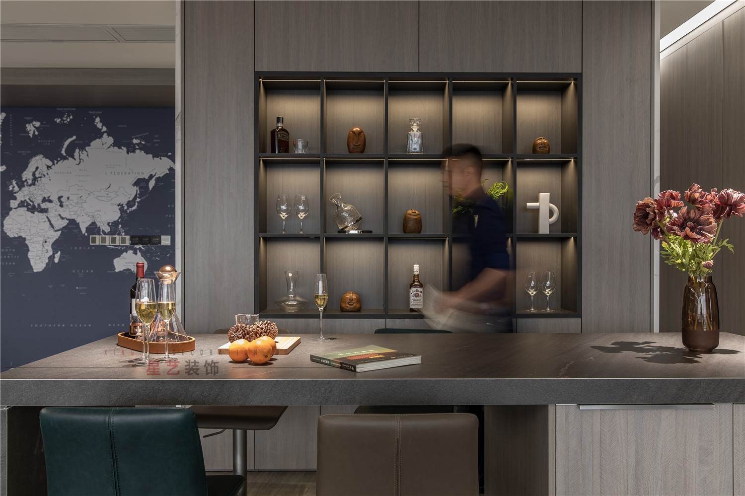 水吧部分直接設計了酒水柜,并且暖色的燈光直接把氛圍感拉滿,在休息時間也能感受溫馨浪漫的環(huán)境。