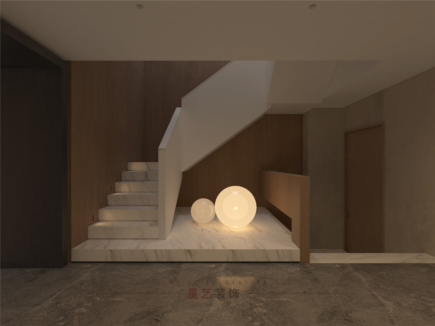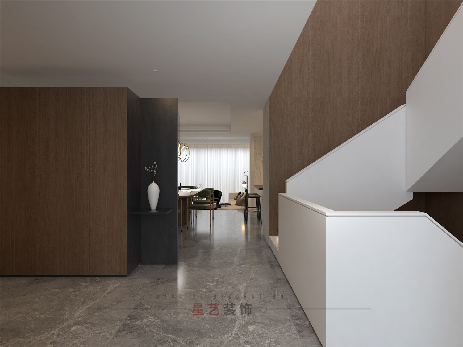 從玄關處用不同深淺的胡桃木配合黑白灰,