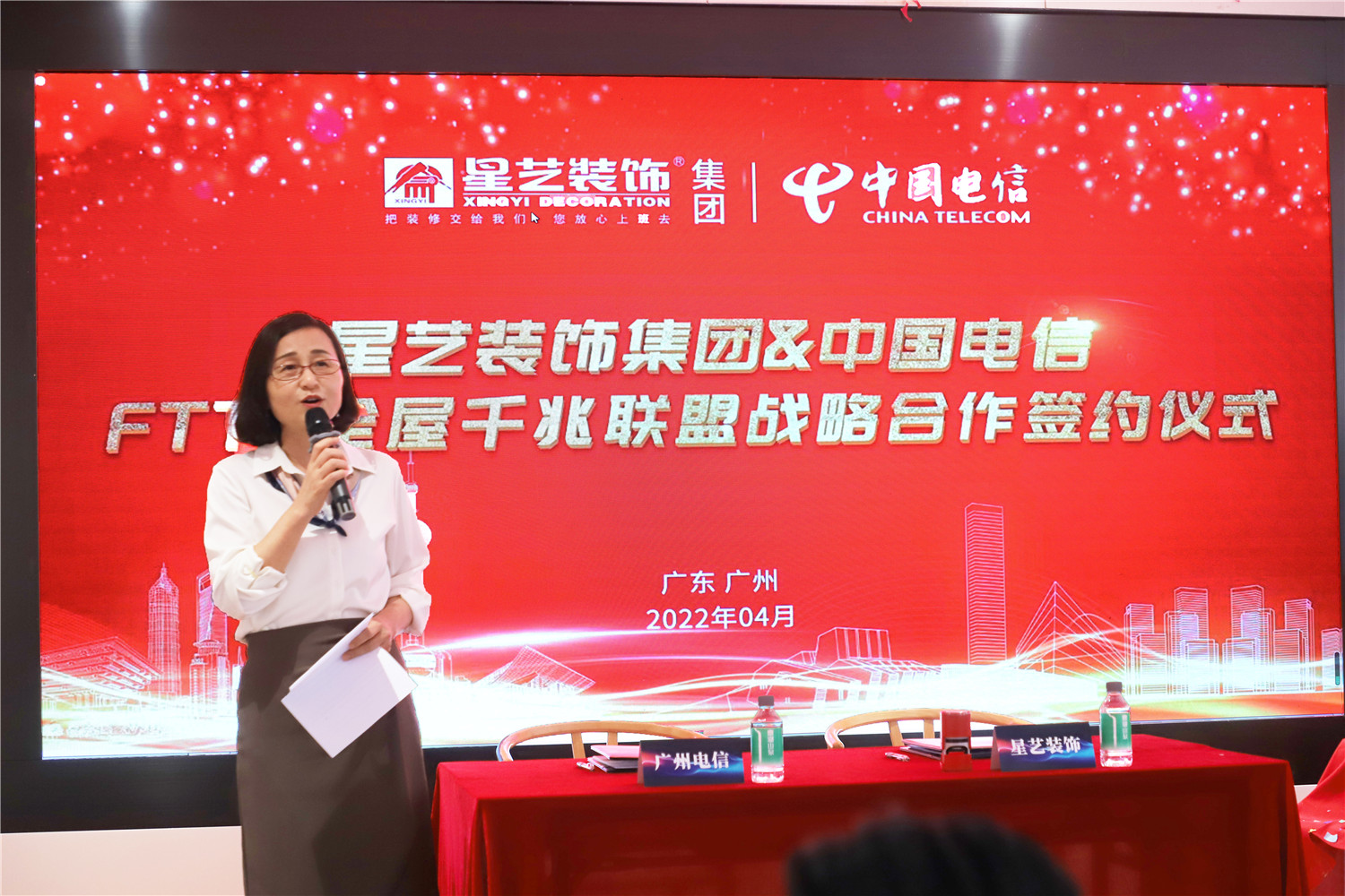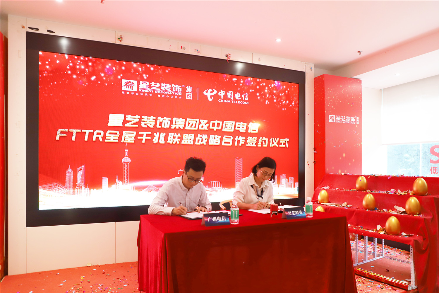 在現(xiàn)場嘉賓的共同見證下,星藝裝飾廣州分公司副總經(jīng)理劉亦萍和中國電信廣州分公司創(chuàng)新中心總經(jīng)理李應(yīng)春代表雙方在戰(zhàn)略協(xié)議書上簽字,開啟了戰(zhàn)略合作的新篇章!