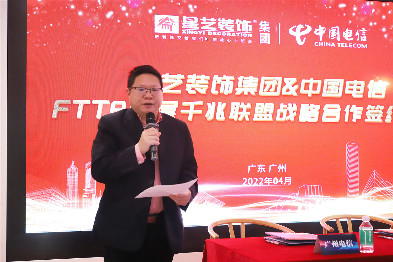 簽約儀式現(xiàn)場,星藝裝飾廣州分公司總經(jīng)理柯志強(qiáng)、星藝裝飾廣州分公司副總經(jīng)理劉亦萍,中國電信廣州分公司關(guān)堅成分別進(jìn)行了致辭發(fā)言。