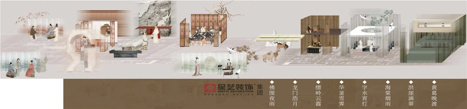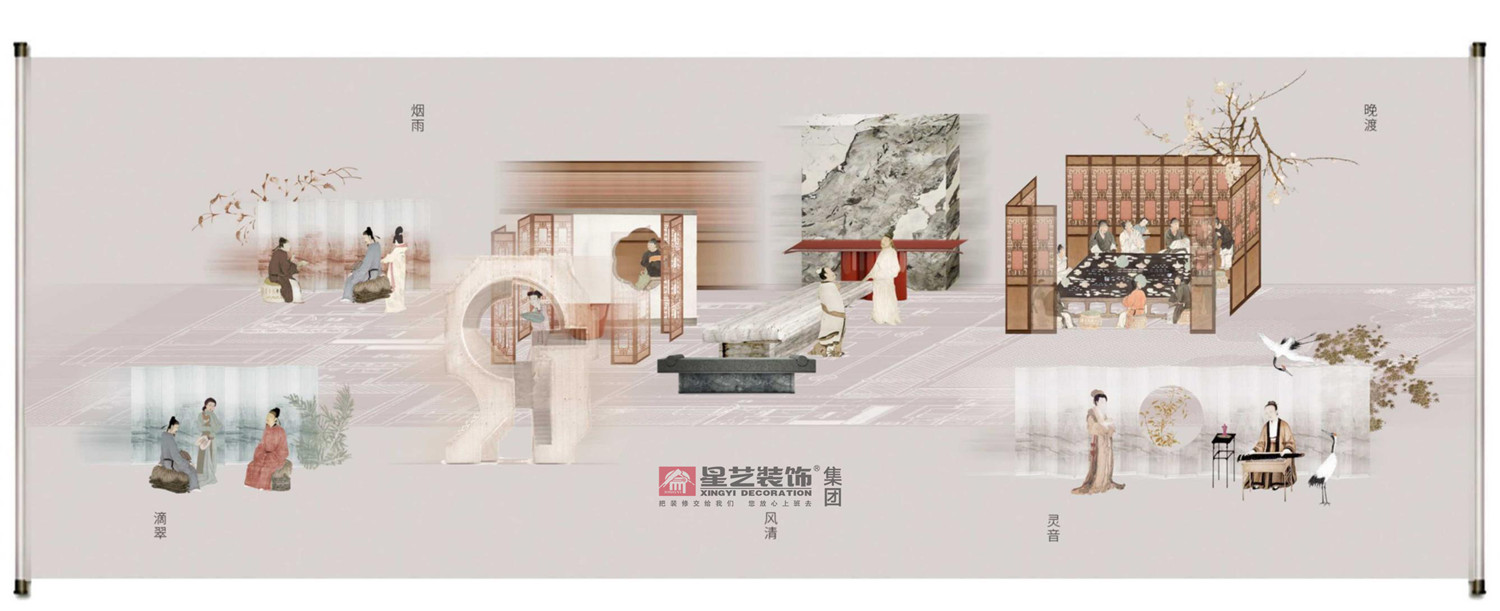 本案以巴蜀十二景為主題思想移步一景,空靈之美耐人尋味,在有象于無象之間,最稱奇妙。設(shè)計(jì)上講究的是氣韻,“氣韻,生動(dòng)是也”是以現(xiàn)代的表現(xiàn)手法呈現(xiàn)中式的精神內(nèi)核。