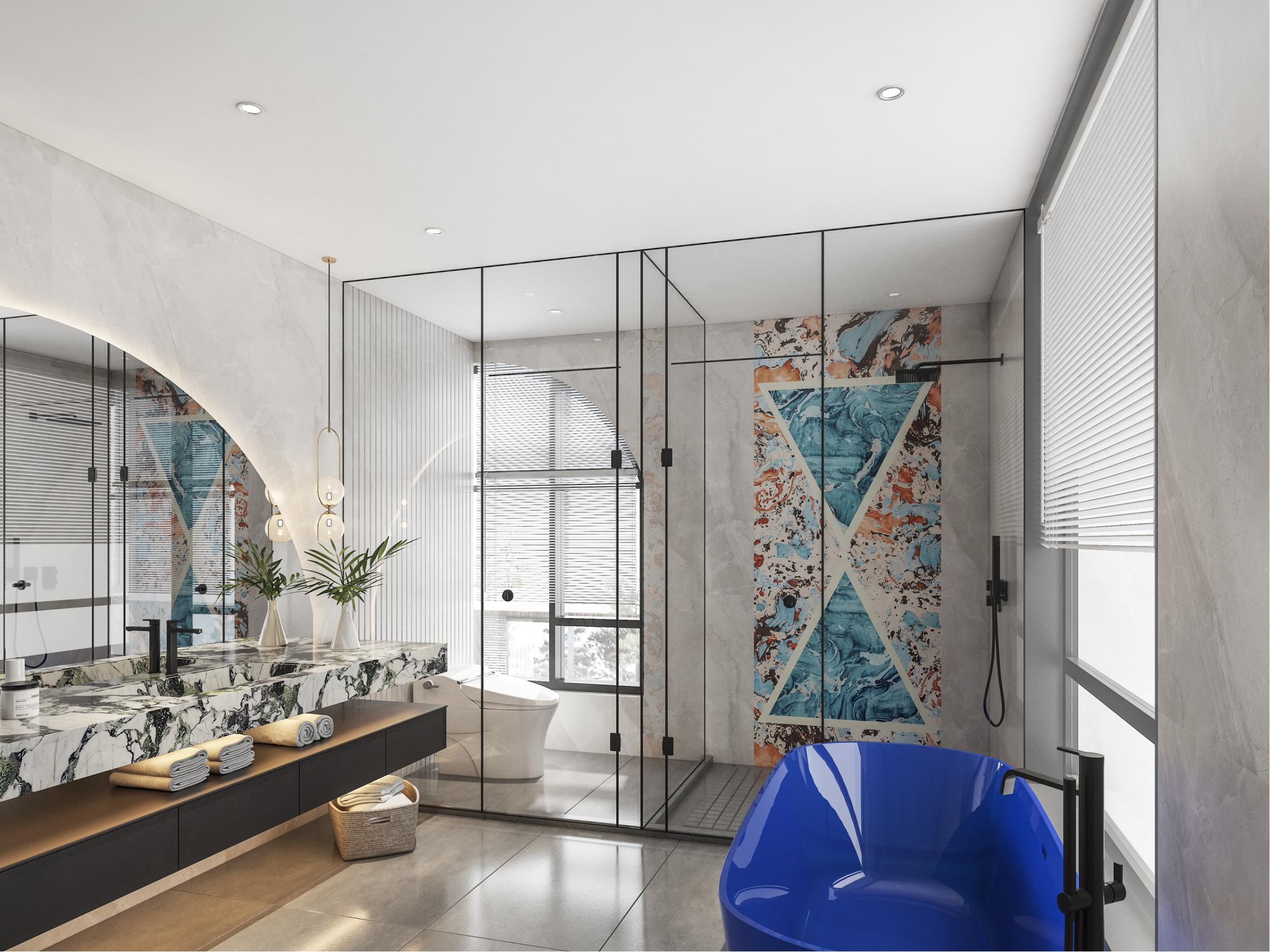 時(shí)尚現(xiàn)代的衛(wèi)生間簡潔而清爽,愛馬仕橙與海洋藍(lán)的巖板增加空間藝術(shù)層次感。
