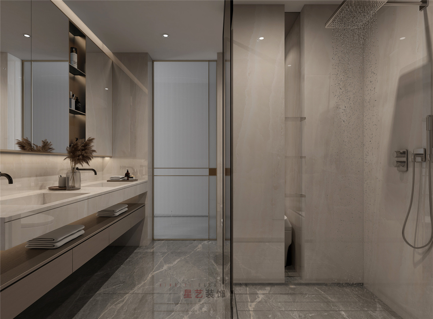 進衛(wèi)生間,水池下方的壁龕設計可以放置換洗衣物或日常洗浴用品,整潔自然
