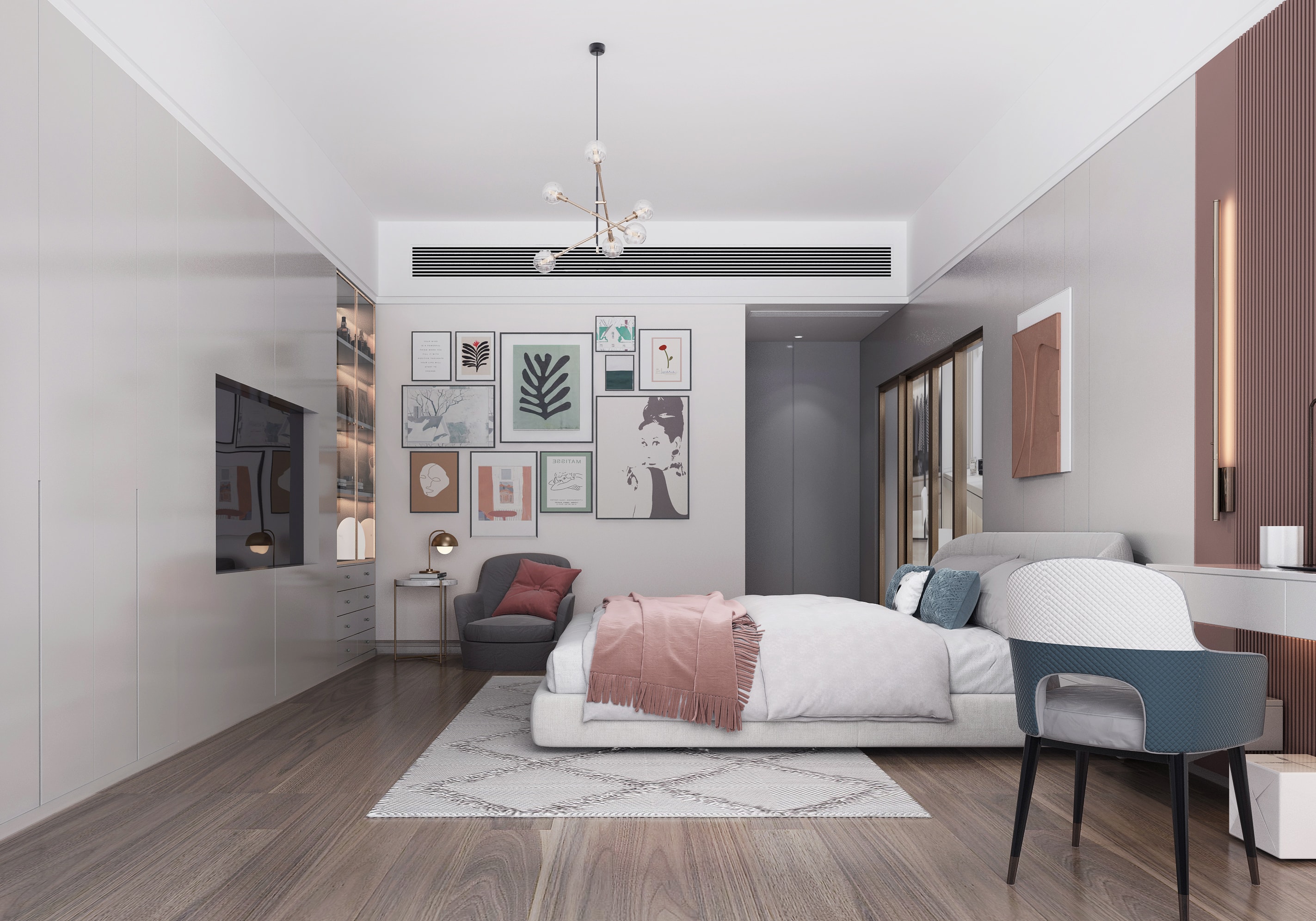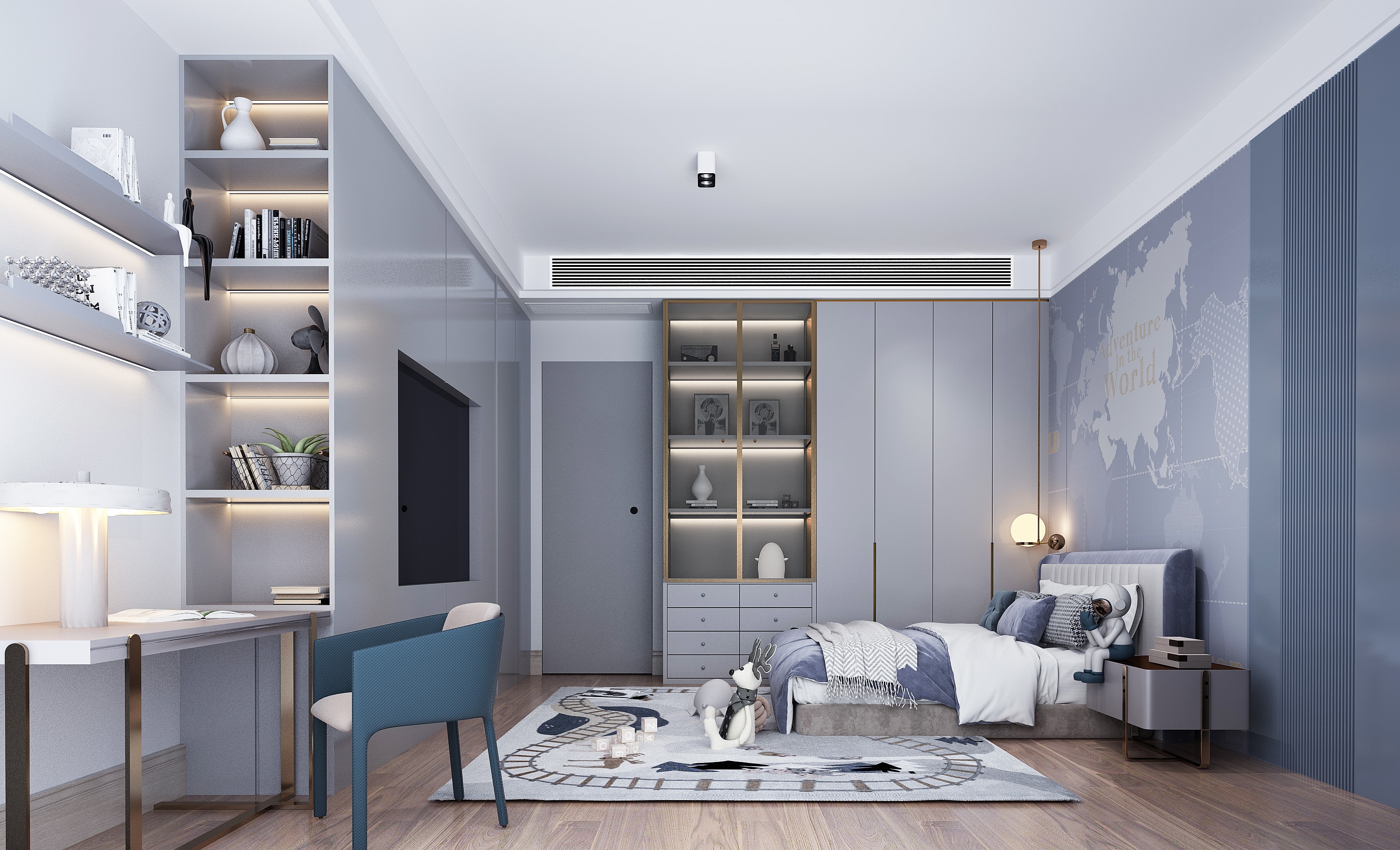 低飽和度的粉色和藍色的兒童房,沒有繁復的線條和切割造型,只在細節(jié)處做好陳設,尊重時間、尊重成長。